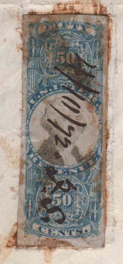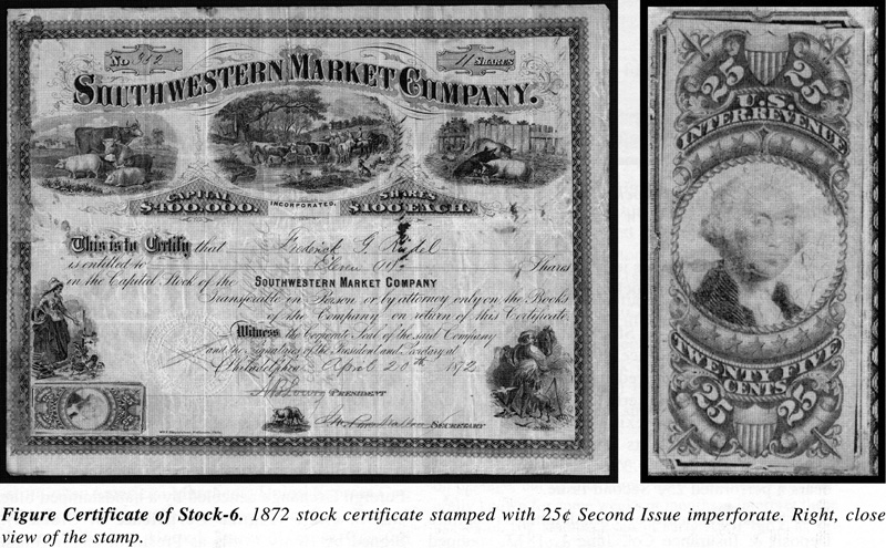 - Single stamp on a stock certificate from the Southwestern Market Company. Chronicled on page 55 of A Catalogue of United States Revenue-Stamped Documents of the Civil War Era by Type and Tax Rate by Michael Mahler, published 1999.