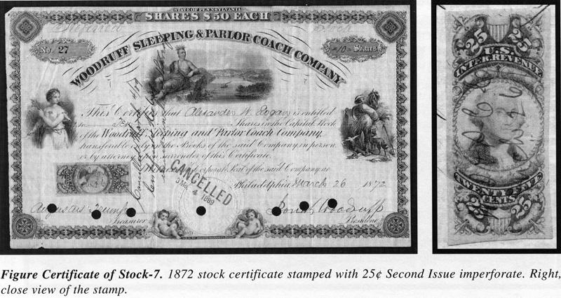 - My example, a single stamp on portion of a stock certificate from the Woodruff Sleeping & Parlor Coach Company. 2014 Philatelic Foundation certificate. Ex-Morrissey.