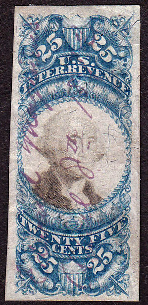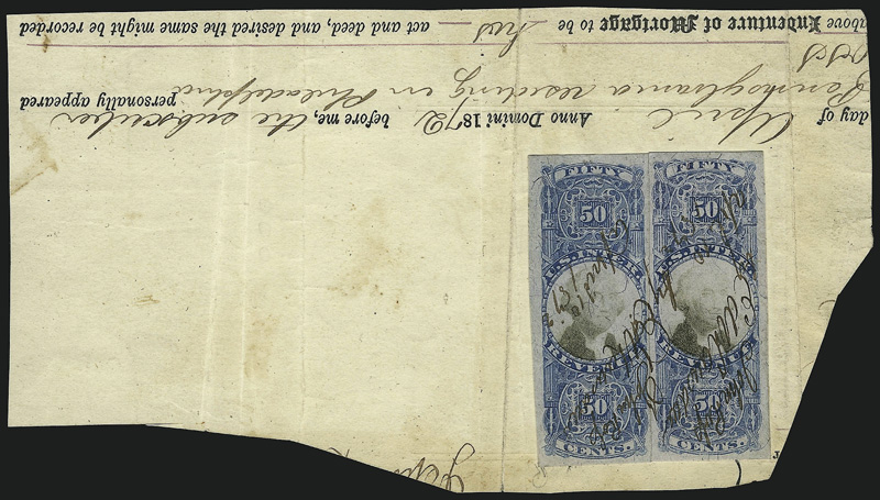The Philatelic Foundation has certified VERY few examples. As far as I can tell from their certificate search, the R115 I own is the second one certified, and my R112 is the first one certified. Searches of online auction archives (Stamp Auction Network, Siegel, Harmer, Schuyler Rumsey, Kelleher) as well as searches of the major revenue auction catalogs I have turn up only a single example at auction, a pair of R115 imperforate singles on document fragment that was part of both the Tolman and Cunliffe collections.