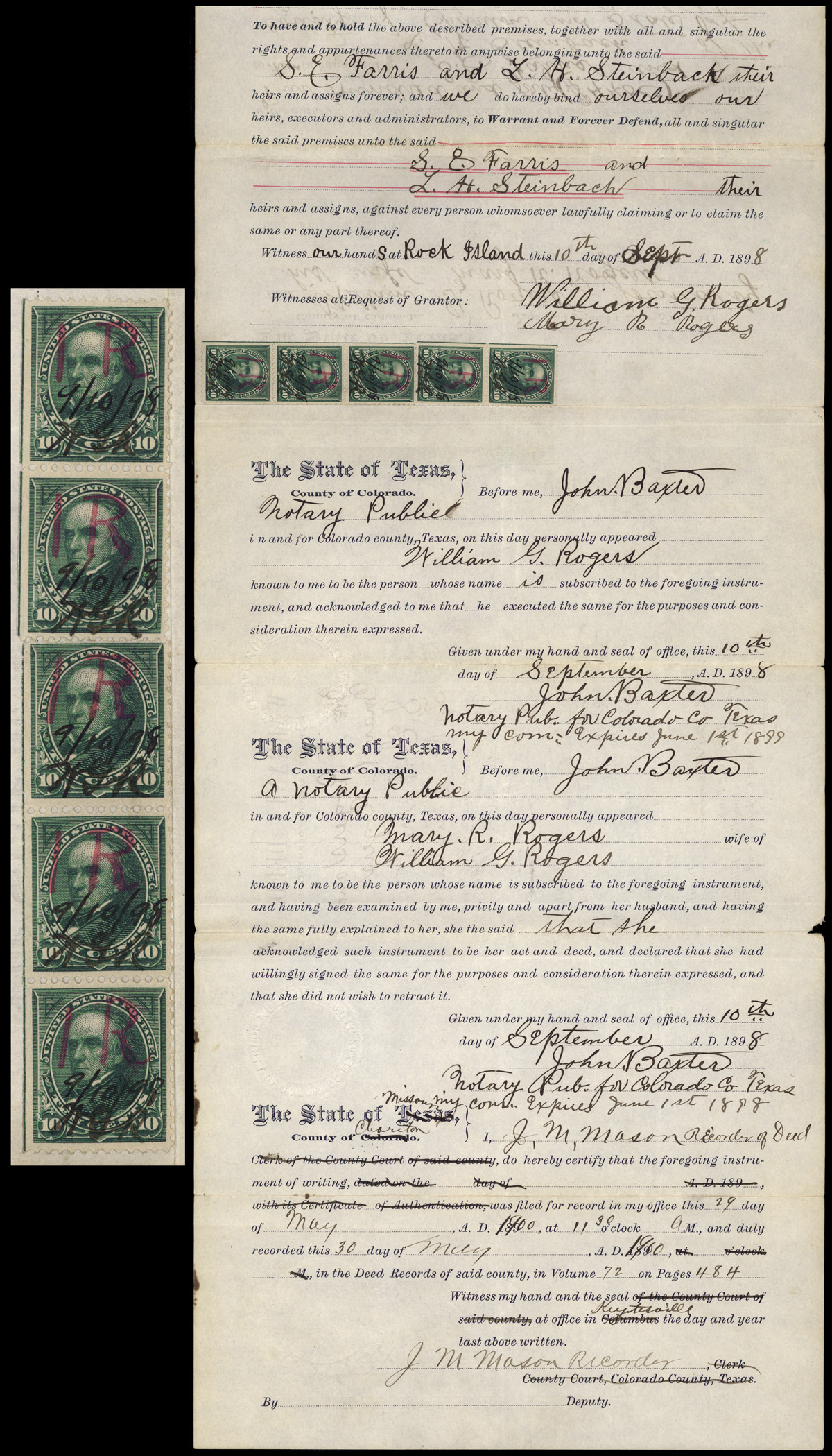 Another 1898 improper use of postage as revenues Another 1898 improper use of postage as revenues January 4, 2016 revenue-collector Comments 0 Comment Same stamps as the improper usage document I got in November, but a different presentation and aesthetics. I like the magenta ‘IR’ hand scribed on each stamp; contrasts very nicely with the green.