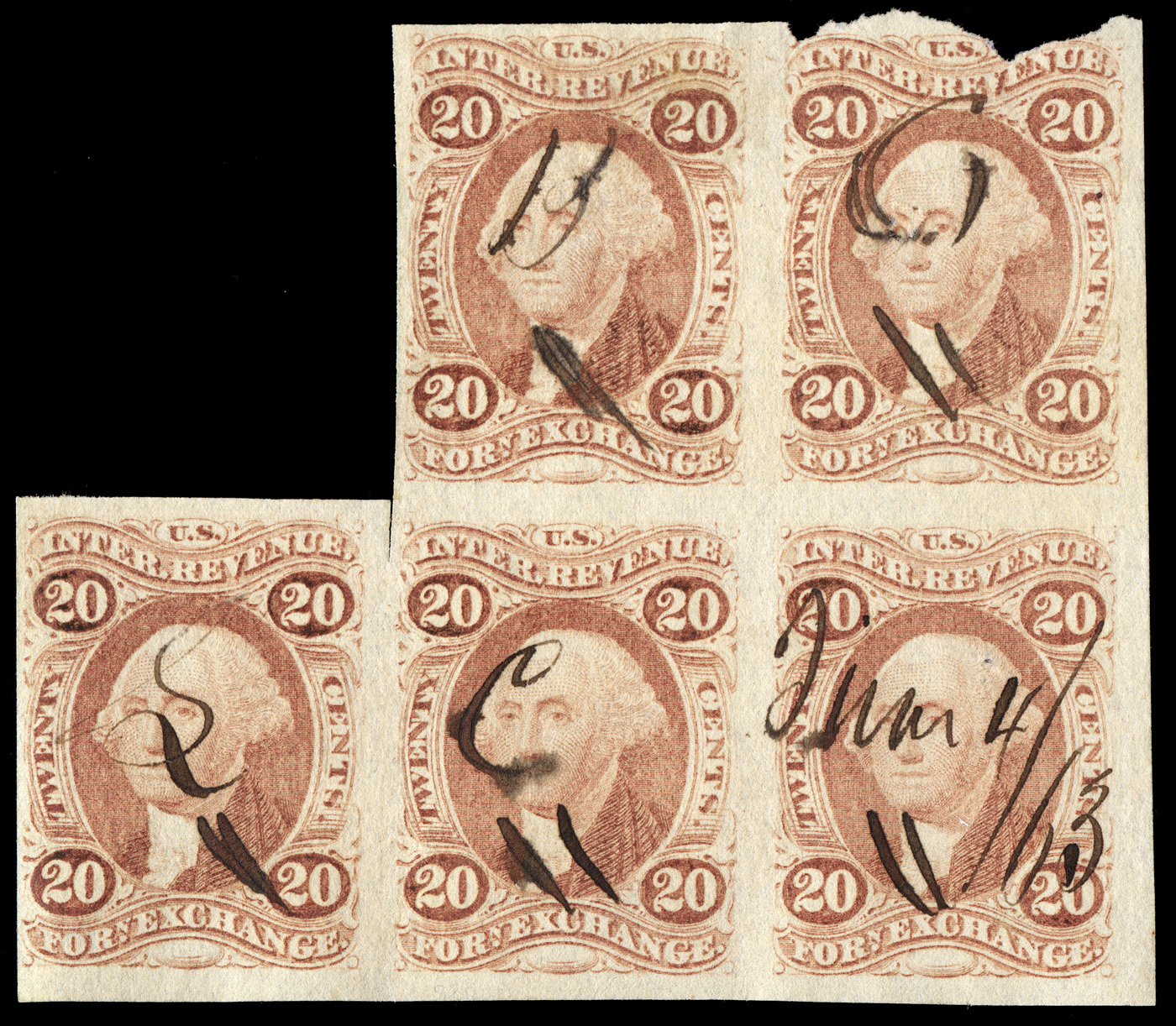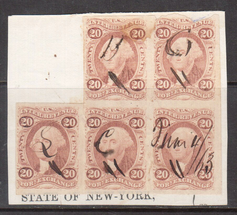 Shown below is an R41a multiple that I purchased on eBay. It was sold as a block of 4 plus a single, when in fact it is an irregular block of 5, making it the 4th largest known multiple per the Curtis census.