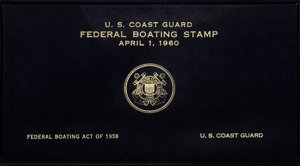 It’s a presentation folder for the RVB1 and RVB2 boating stamps, issued April 1, 1960. Inside are complete sheets of 10 of the two stamps behind protective plastic.