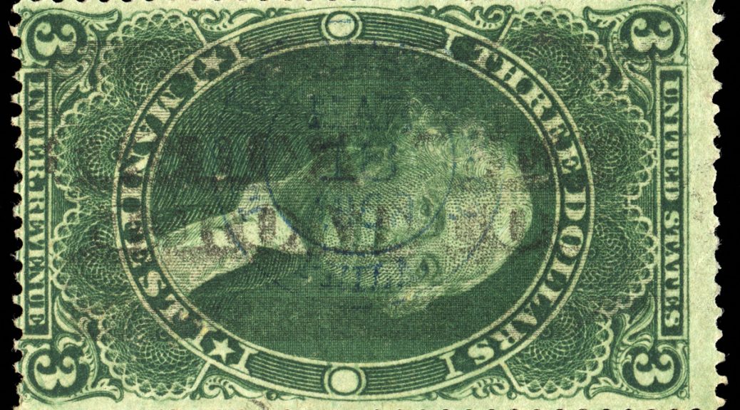 I saw this on eBay and it looked odd, so I figured I’d take a flyer on it. Scott R86c, the $3 Manifest, with a blue circular handstmp cancel, and then what upon receipt I initially thought was document offset… but now I don’t think so.