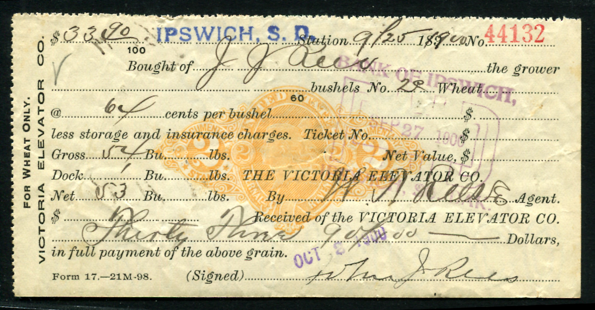 Shown below are 3 different RN-X7 receipts from the Victoria Elevator Co., used in different cities in South Dakota. They are very similar. My question concerns the third one listed. What is the second transaction that would have incurred the additional tax, thus precipitating adding the battleship revenue stamp?
