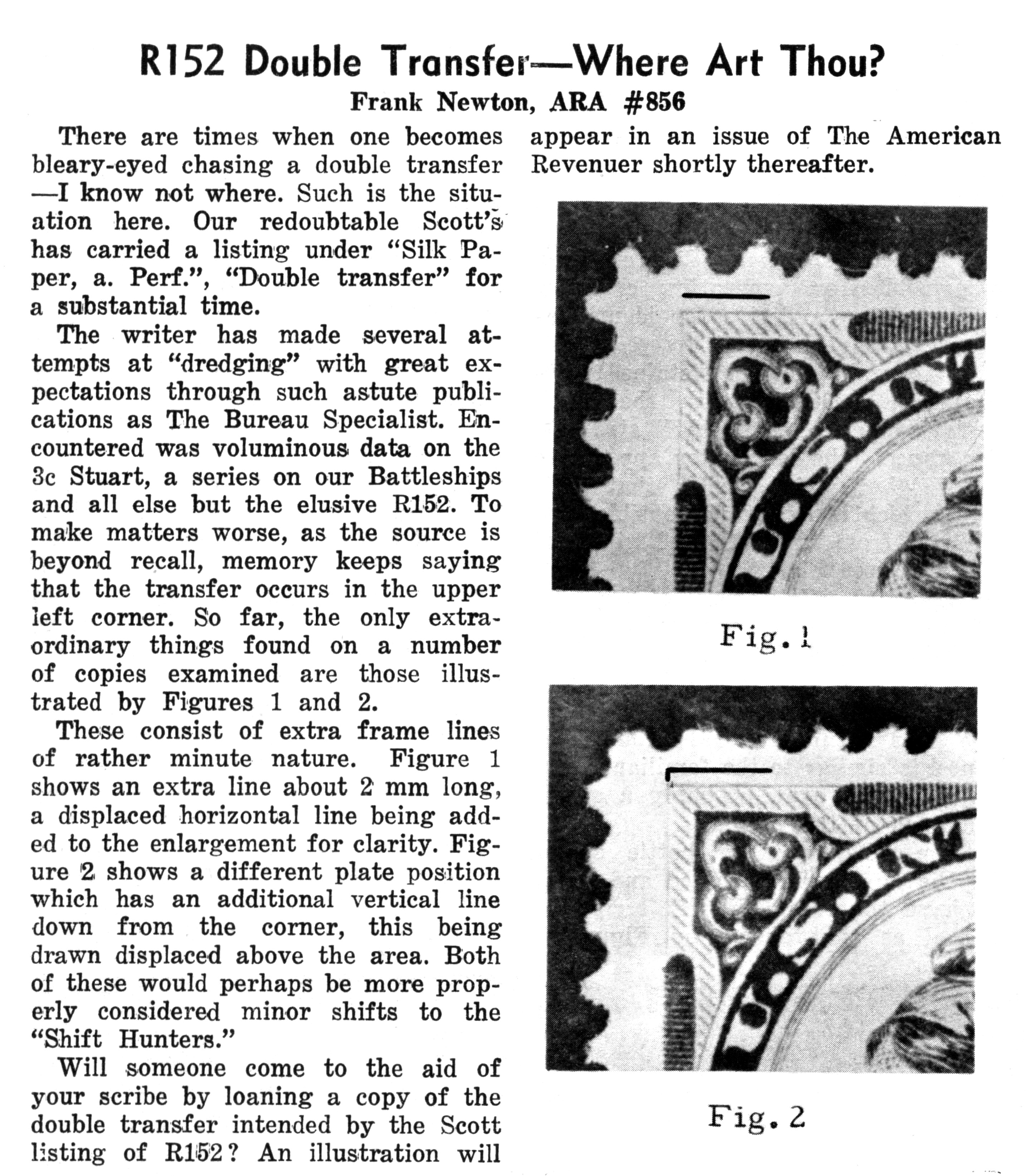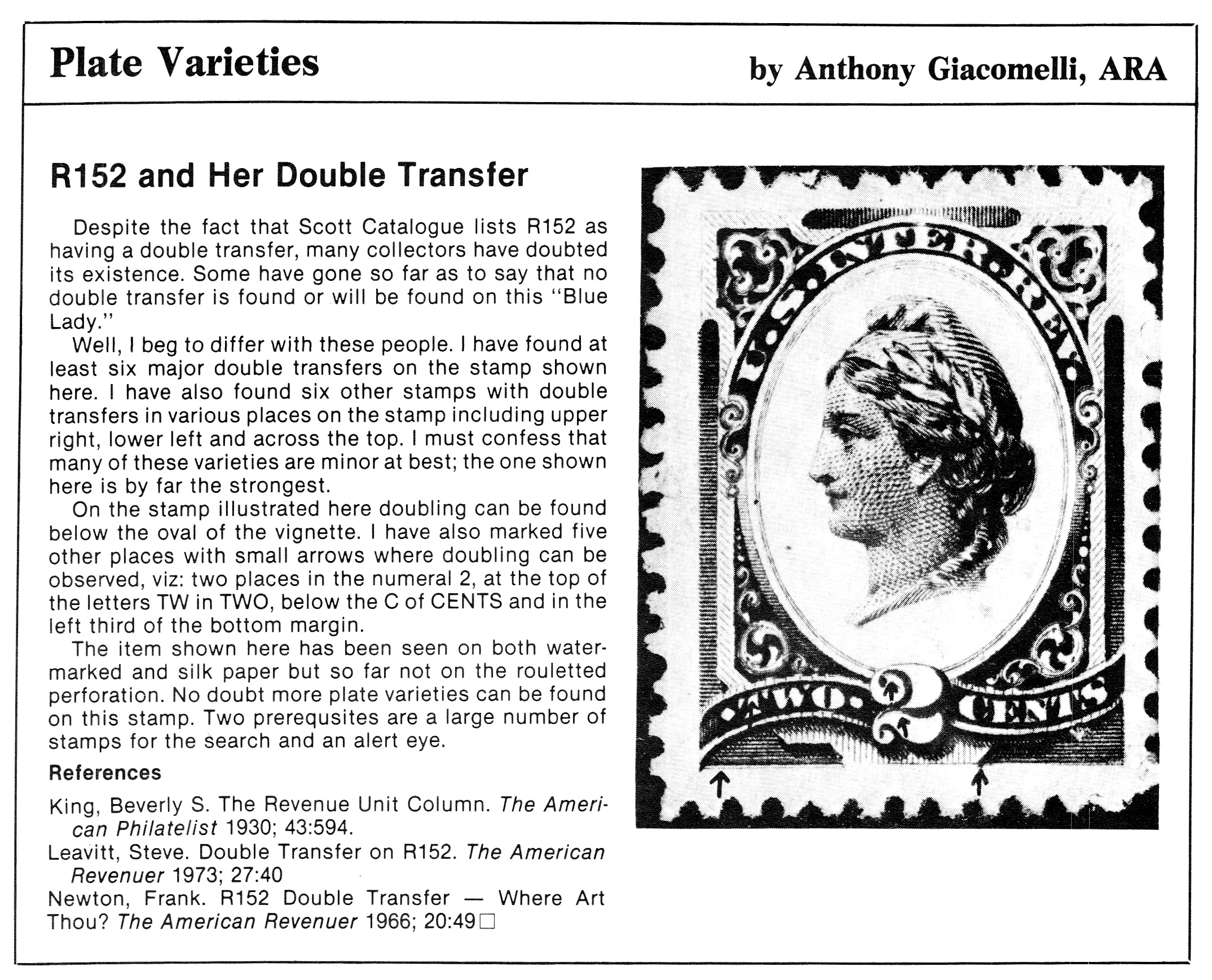 I’ve not seen any definitive references to plate varieties on R152; it wasn’t included in the Shift Hunter Letters. There have been a couple of brief articles in The American Revenuer, showcased below.