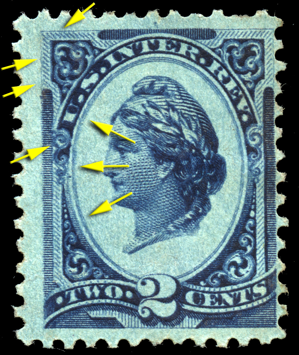 5. This one is likely a printing anomaly rather than a plate variety. Many of the details along the left side are mushy, possibly the result of the paper bouncing against the plate? Also some muddiness in the portrait.