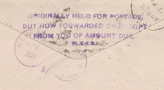 5. A partial strike of “ORIGINALLY HELD FOR POSTAGE / BUT NOW FORWARDED ON RECEIPT / FROM YOU OF AMOUNT DUE / (N.Y. – I.D.).”