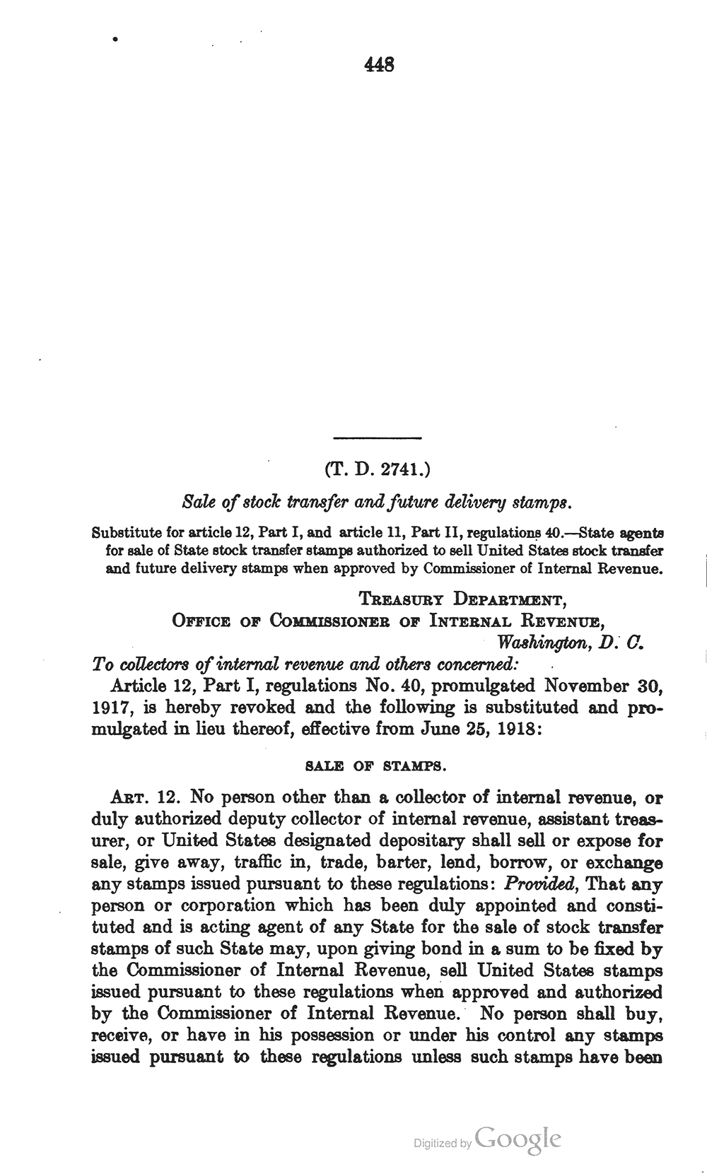 Remember, they would have printed up the basic stamps first (the blue portion), and then overprinted them for the various uses as needed. The basic documentaries were being used all along, so this stamp might have been printed months before being overprinted for stock transfer and numbered. Double transfers would certainly have existed earlier on those documentaries. Clearly it has to be from the first group used for this specific purpose, so it is probably the first double transfer overprinted stock transfer. Alas, my example is number 1052. Still early, but a 1921 usage. July 1 would have been the first day of the new fiscal year (that’s why all special tax stamps were good until June 30), so it is very possible that it is the EKU as a first day usage; you would have to look up the tax laws to see exactly when these went into effect. Scott says 1918, so July 1 seems very likely, although it is not guaranteed.