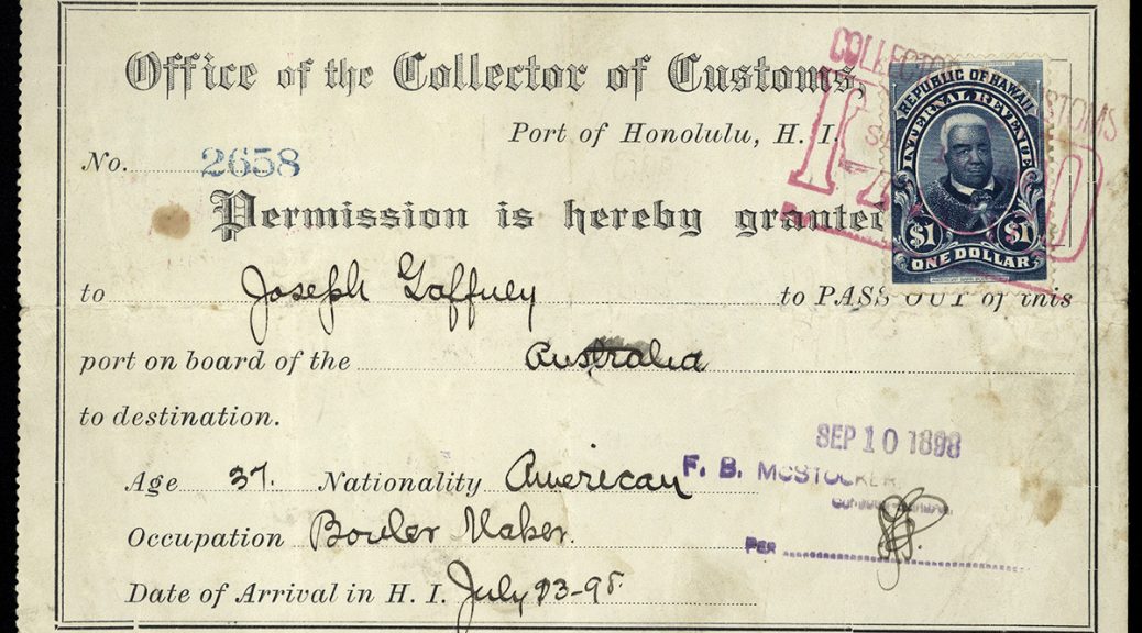 This is a small document from the Port of Honolulu Office of the Collector of Customs, dated September 1898, granting permission for a boiler maker who had been in Hawaii since July 1898, to leave the island. It appears to be the equivalent of a modern day exit visa (not sure what the document would have been called at the time). Very unusual (to me anyway).