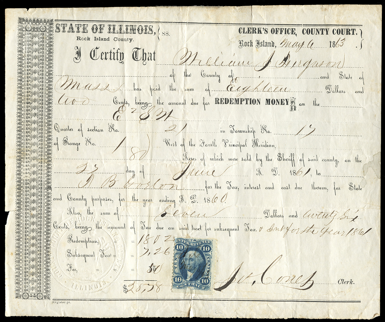 2. “Certificate not specified elsewhere” which was 10 cents through March 2, 1863, at which point it was reduced to 5 cents. The date of the document falls 2 months after that date, but it’s quite possible that in Rock Island, IL (total population just over 5,000 in 1860) they were unaware of the recent change in tax rate?