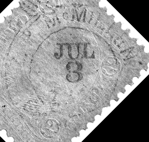 Returning back to my R15e census, all save one are off document (more on that one later). Most of the cancels are manuscript with only initials and date, so not much can be gleaned there, but a few have handstamped cancels… all from Philadelphia or the area (one in New Jersey). There is one purported R15e with a San Franciscso handstamp, but it was offered without cert and subsequently withdrawn prior to sale, so I am exlcuding it.