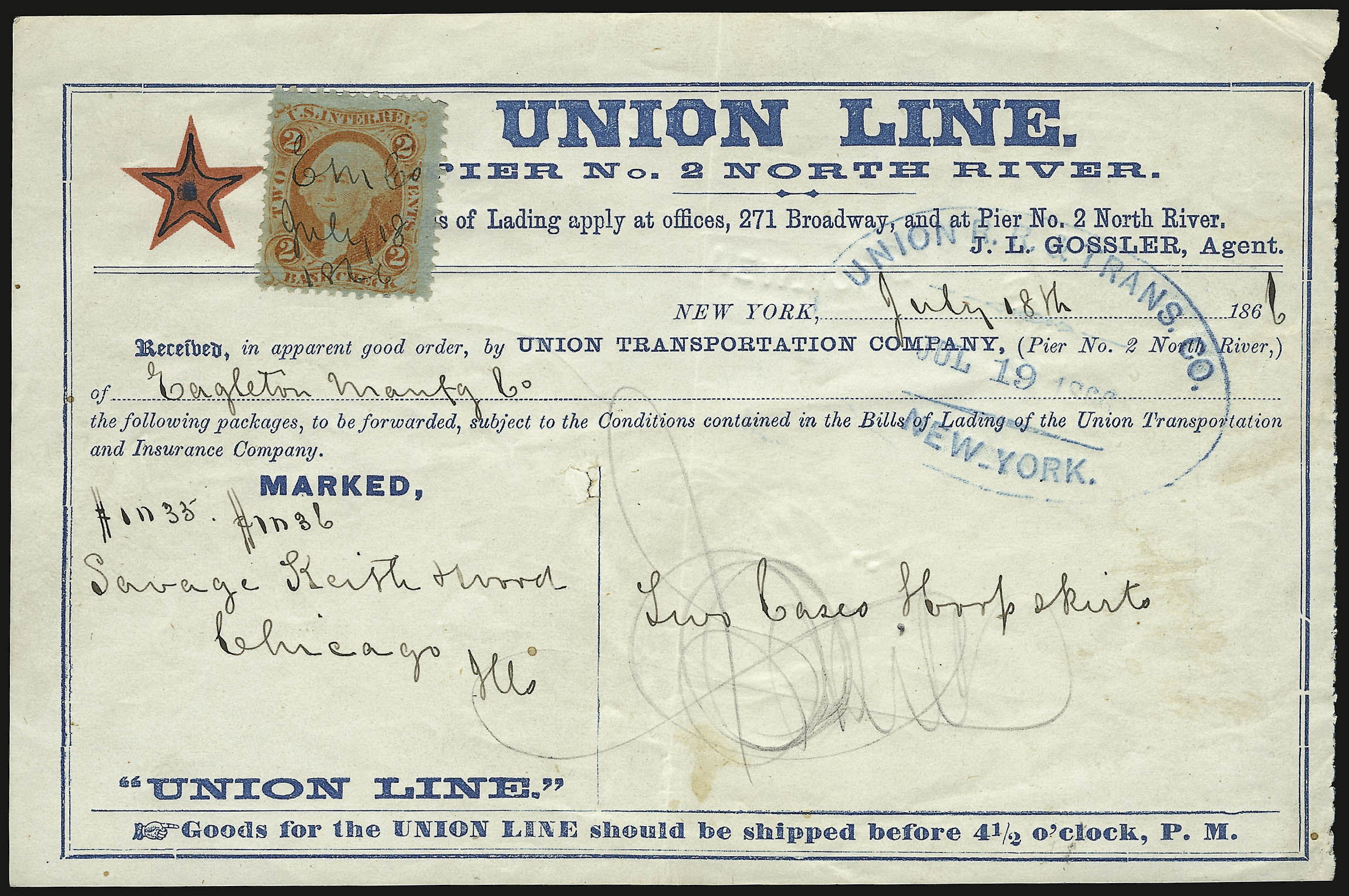 I can’t draw any conclusions from the dates on the New York and Philadelphia documents or the cancel dates on the individual stamps as to whether one preceded the other, and the Illinois CDVs are undated as to year. The only limiting factor as to the last is that CDVs were only taxed from August 1, 1864 through July 31, 1866, and the end of that window overlaps with the New York and Philadelphia uses of both R6e and R15e.