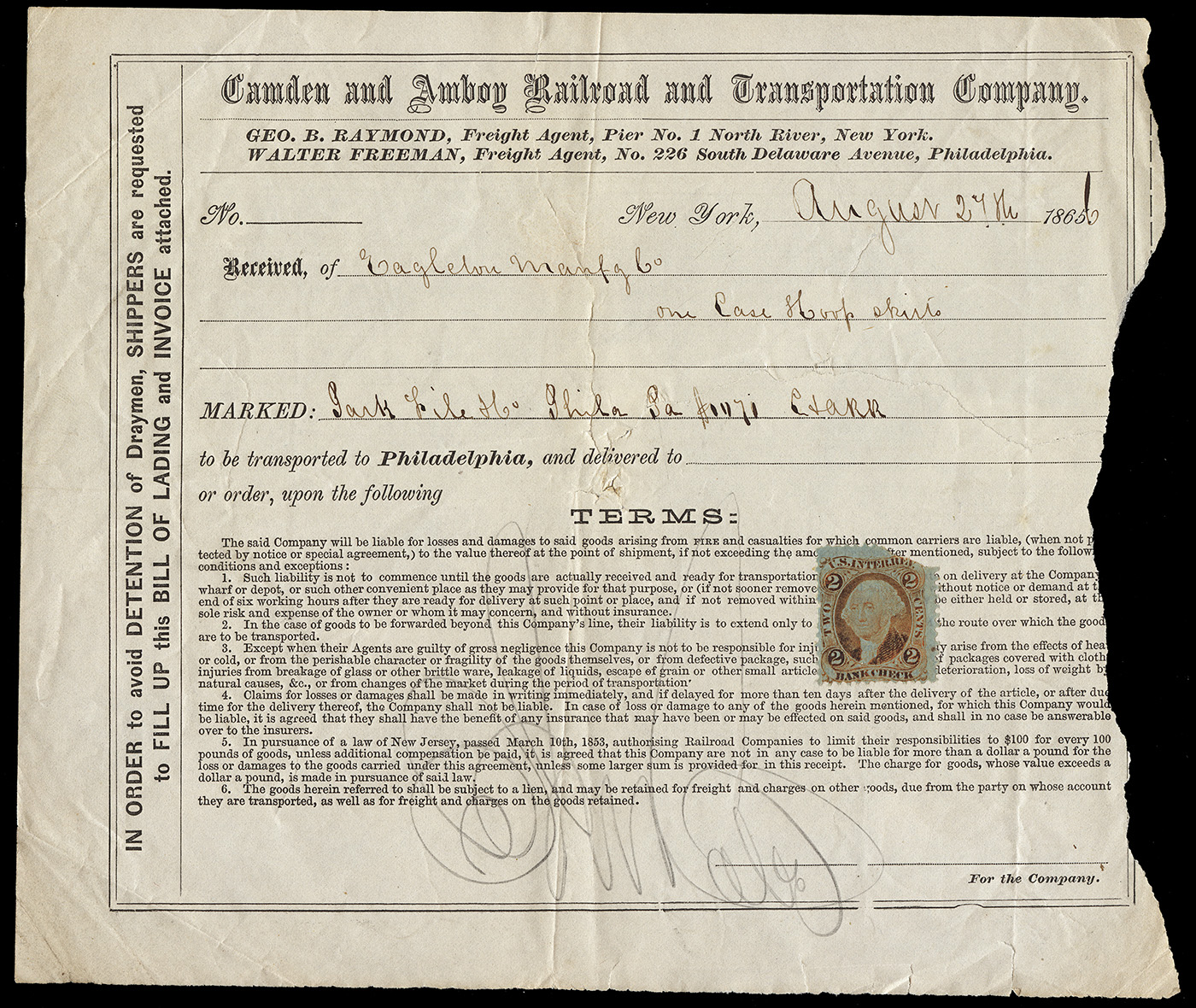 And lastly, the document I was scanning that caused me to notice, a bill of lading from the Camden and Amboy Railroad and Transportation, also with goods from the Eagleton Manufacturing Co. Both document and stamp are a bit mangled, but it is what it is. This came from the document balance lot in Brian Bleckwenn’s collection sale at Siegel.