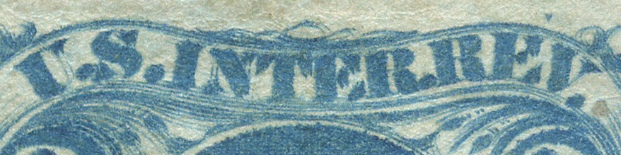 Contrast the portrait lines, especially the forehead, and corner elements with the following example R13c. It too is a double transfer, but the doubling is relegated to the perhiphery of the design. I use this as a comparison image, as it is a very crisply struck example of the stamp.