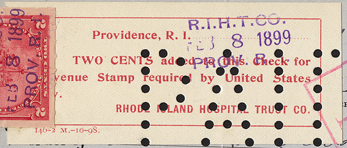 This is an 1899 check drawn on the Rhode Island Hospital Trust Co., with a printed slip attached by the revenue stamp (the slip itself has no adhesive), which reads “TWO CENTS added to this check for Revenue Stamp required by United States law.”