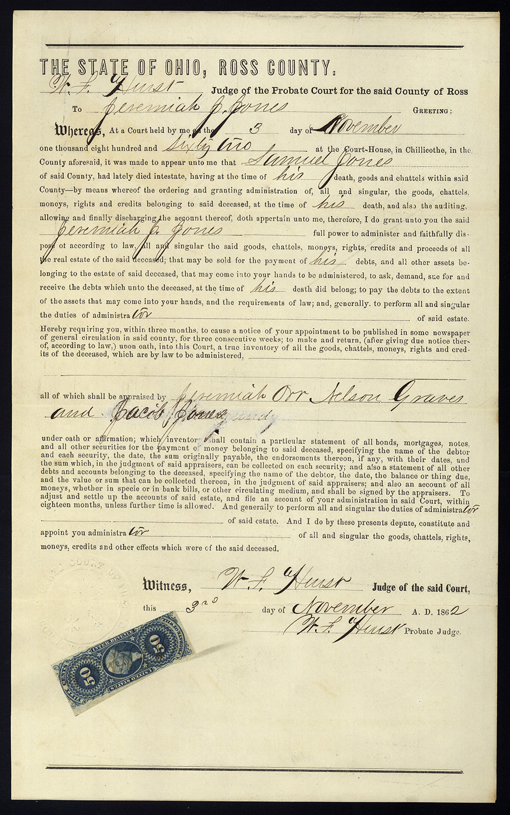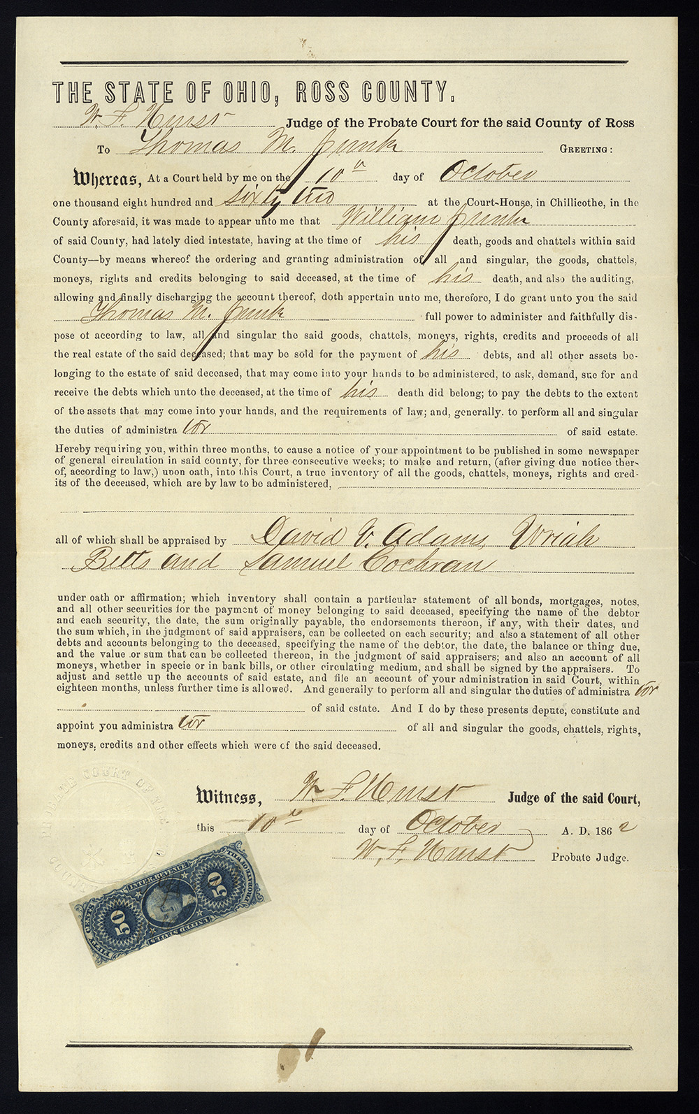 It’s a group of three probate of will documents from Ross County, Ohio, dated November 3, October 18, and October 10, 1862… EXTREMELY early. All are franked with 50-cent Probate of Will imperforate stamps, so EMUs (early matching usages) since that was required by law at that point in time (requirement rescinded in December of 1862).