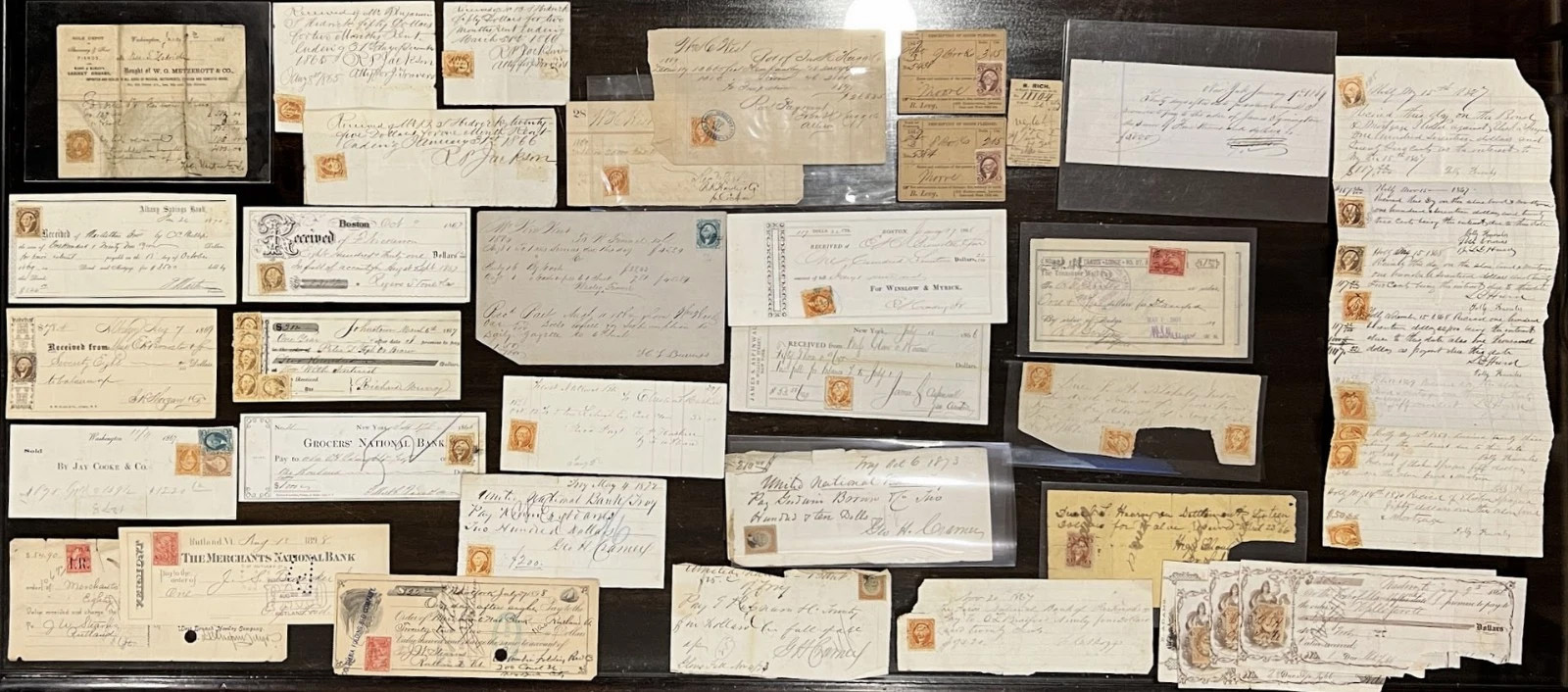 - An 1868 promissory note taxed 5 cents, with a protest on reverse with 25-cent revenue affixed.