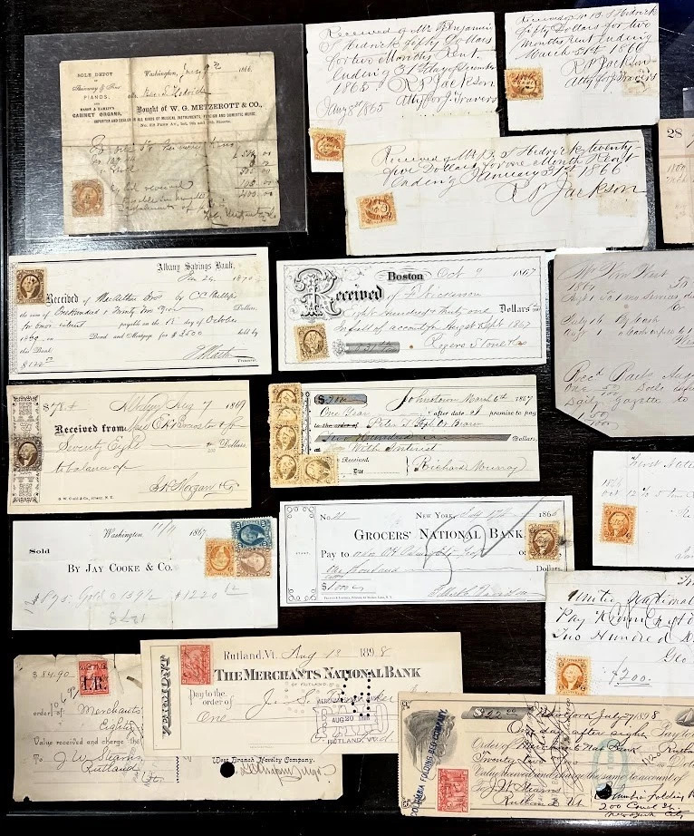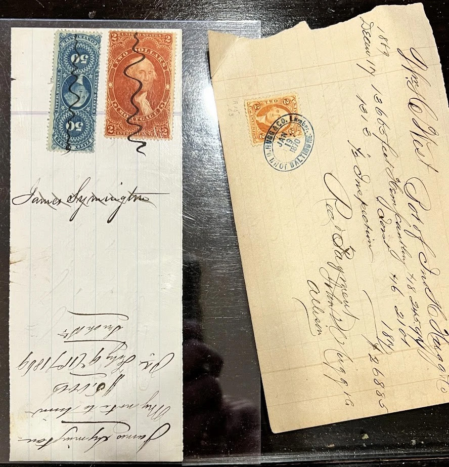 - A beat up 1866 small billhead from “W.G. Metzerott & Co.” in Washington D.C., dealer for Steinway & Sons for the purchase of a piano, with tied 2-cent bank check, and on the reverse is a handritten five-year warranty policy for said piano, taxed 5 cents, presumably as an agreement. Really neat!